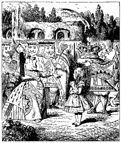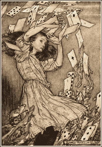`Well!' thought Alice to herself, `after such a fall as this, I shall think nothing of tumbling down stairs! How brave they'll all think me at home! Why, I wouldn't say anything about it, even if I fell off the top of the house!' (Which was very likely true.)